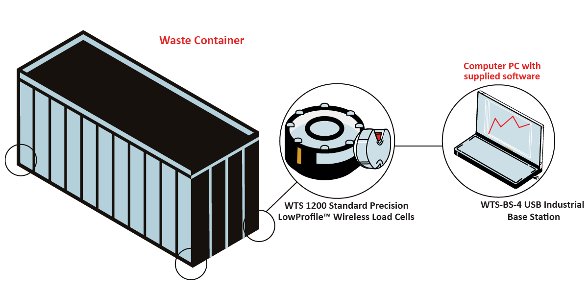 A waste management company wanted to measure the capacity of their waste containers to know when it is time to dispose the waste. Interface provided Model WTS 1200 Standard Precision LowProfile™ Wireless Load Cells to be installed at the bottom of each waste container leg to measure the sum weight of the container. The real time weight data is then transmitted to the WTS-BS-4 USB Industrial Base Station with the supplied Log100 software. Using this solution, the customer was able to determine when their waste container was at full capacity to dispose of the waste, or to transfer it in a timely manner.