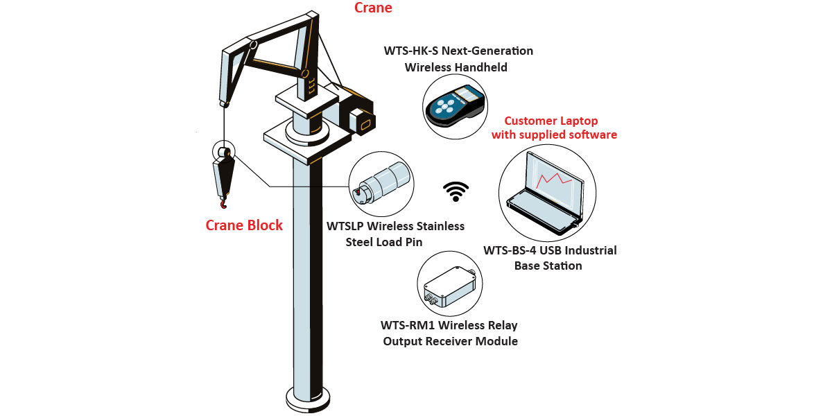 The next example features a crane application in which the customer wanted to detect whether a crane block could lift a heavy load securely to keep working conditions safe for personnel. The customer specifically wanted the solution to include an alarm feature that notified them if lifting capacity was exceeded in real-time. Using a WTSLP Wireless Stainless Steel Load Pin in place of a load bearing pin in the crane block, they could measure the force being applied by the heavy load. Data will be transmitted and displayed through both the WTS-BS-4 USB Base Station. It can also be paired with the WTS-BS-1-HA Wireless Handheld for real-time safety monitoring. The WTS-RM1 Wireless Relay Output Receiver Module triggers an alarm when maximum capacity has been reached. The customer was able to verify if the crane was operating safely and was always functional enough to lift it’s working load limit (WLL) or safe working load (SWL) capacity. The added alarm feature is critical for notifying users when the crane reaches unsafe limits during operations.