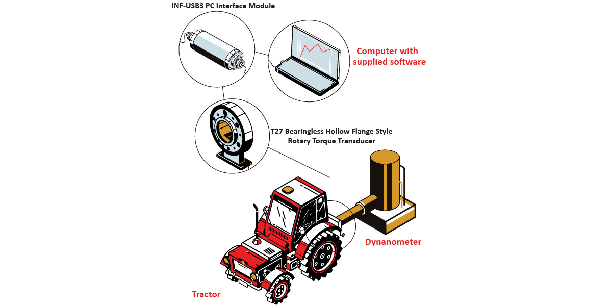 A customer wanted to measure the torque and speed of their tractor’s PTO (power takeoff test) system, ensure the tractor’s PTO system was functioning properly, and measure the torque being delivered to an implement. Interface’s solution was to use its T27 Bearingless Hollow Flange Style Rotary Torque Transducer to measure the tractor’s torque and speed of their tractor’s PTO system. The T27 Bearingless Hollow Flange Style Rotary Torque Transducer is bolted to the tractors PTO shaft. A dynamometer is attached on the other end and the transducer can measures the tractor’s torque and speed with high accurate results. With the INF3-USB PC Interface Module the customer was able to display, graph, and log the recorded torque and speed of the tractor’s PTO system with the supplied INF3-USB software. Using this solution, the customer was able to successfully and accurately measured the torque and speed of the tractor’s PTO system. Read more about tractor PTO torque testing here.