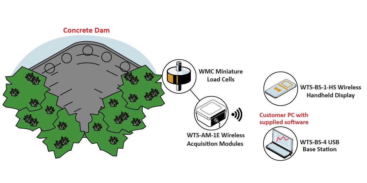 Interface’s WMC Miniature Sealed Stainless Steel Load Cells with multiple WTS-AM-1E Wireless Acquisition Modules connected to them, are small in size and perfect for measuring tension and compression. Multiple WMC’s can be installed around the arch of the dam, so when flooding occurs, the WMC can transmit data and notify the customer through one of our Wireless Telemetry Systems.