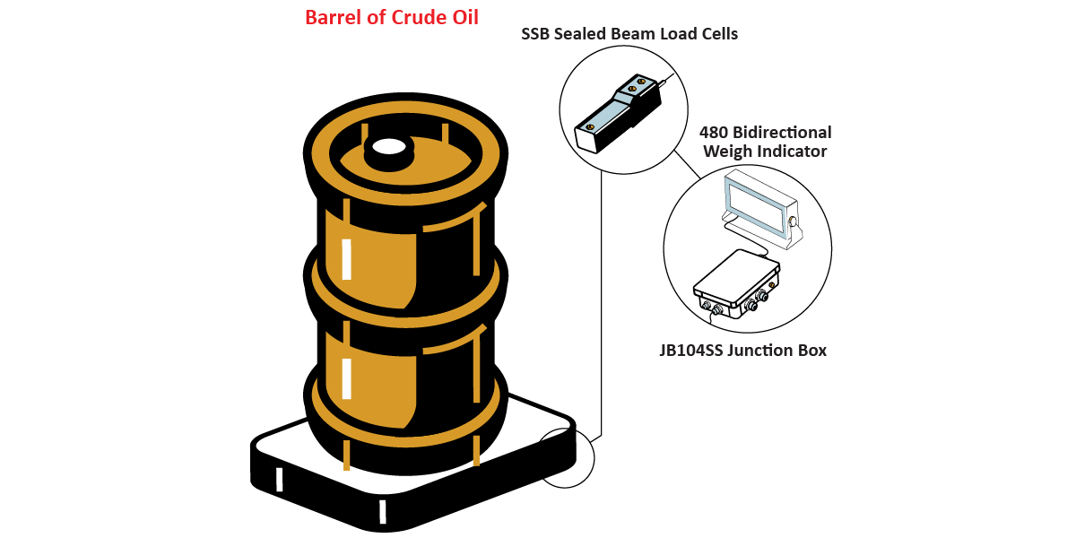 Interface’s solution is to secure four SSB Sealed Beam Load Cells at the bottom of a metal platform. The SSB Sealed Beam Load Cells will measure the force applied by the weight of the barrels of crude oil. All four SSB’s are connected to a JB104SS Junction Box, which is connected to the 480 Bidirectional Weight Indicator, and combined the accurate weight results are displayed.