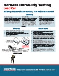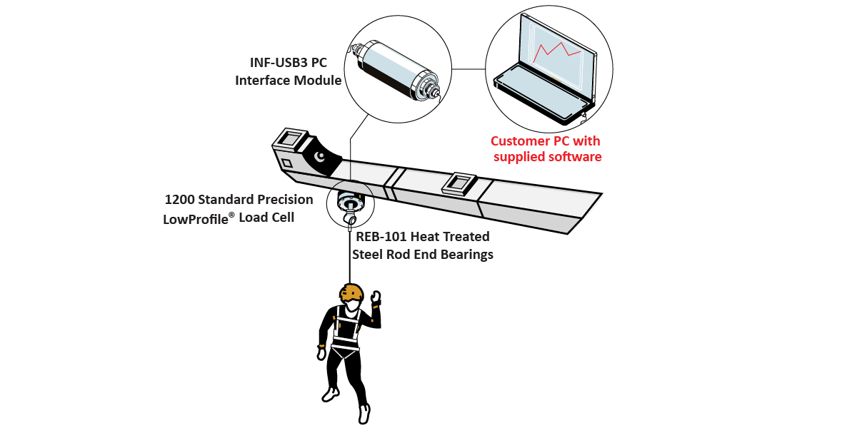 A drop test apparatus uses an Interface 1200 Standard Precision LowProfile® Load Cell attached to a cable and loaded harness. The loaded harness is dropped from a specified height to measure the force generated during sudden stop at maximum cable extension.