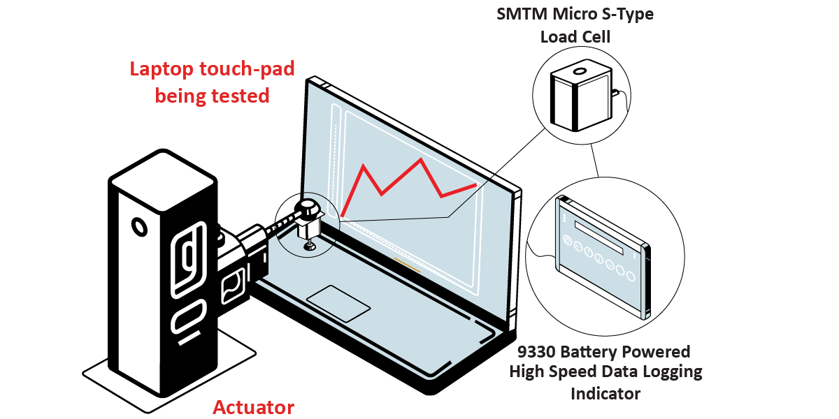 A laptop manufacturer wants to test their mouse touch-pads. They want to ensure it is functioning properly, with just the right amount of sensitivity when touched. They need a system that measures the force it takes for the mouse pad to activate a response on the laptop.