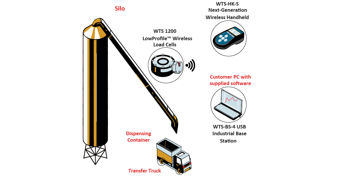 Interface suggests a wireless solution, by installing WTS 1200 Standard Precision LowProfile™ Wireless Load Cells at the legs of the grain dispensing container. The 1200 can measure the distribution correlation of the grain as it inputted and outputted from the container. Results will be transmitted and displayed using the WTS-BS-1-HA Handheld Display for multiple transmitters, and will be logged and graphed using the WTS-BS-4 USB Industrial Base Station.