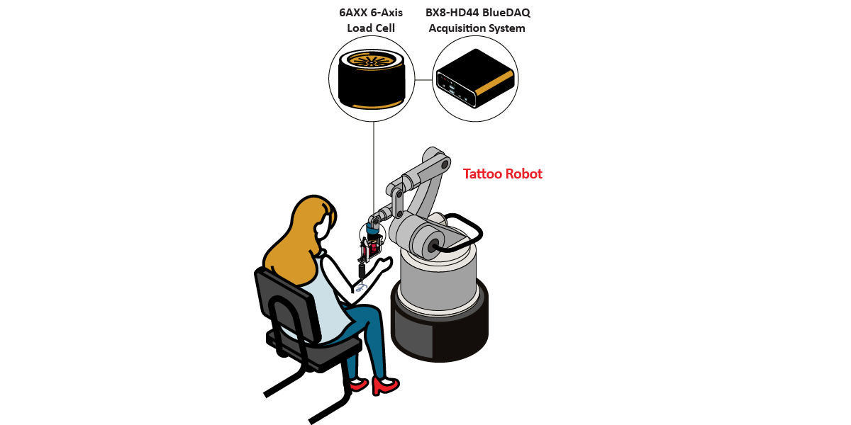Interface suggests integrating the 6AXX Series Multi-Axis Load Cell into the robotic arm near the needle assembly. The load cell measured forces and torques in all six axes in real time, allowing the system to adjust dynamically to the curves and textures of the skin during movement. When connected to the BX8-HD44 Data Acquisition, data can be logged, graphed, and displayed when connected to a computer with supplied BlueDAQ software.