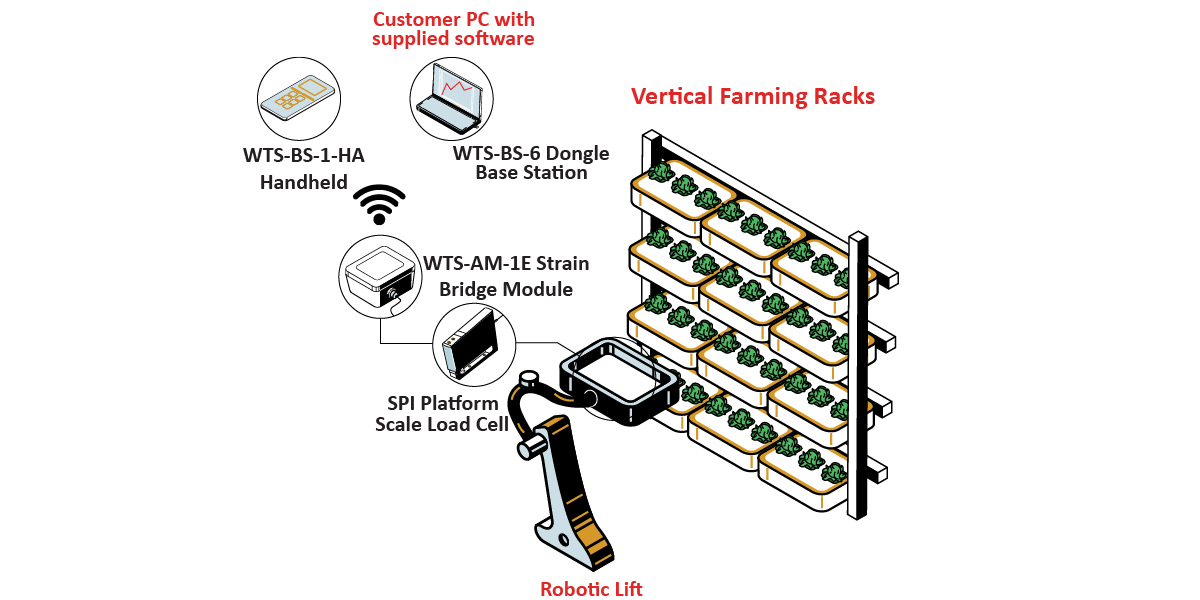 Interface suggests installing SPI Low Capacity Platform Scale Load Cells, along with WTS-AM-1E Wireless Strain Bridge Transmitter Modules, in the center of the platforms of the robotic lifting system that move around the produce. The WTS-AM-1E’s wirelessly transmit the data collected from the SPI’s to the WTS-BS-1-HA Wireless Handheld Display for multiple transmitters, and the WTS-BS-6 Wireless Telemetry Dongle Base Station when connected to the customer’s PC. Results can be displayed, logged, and graphed seen in real time.