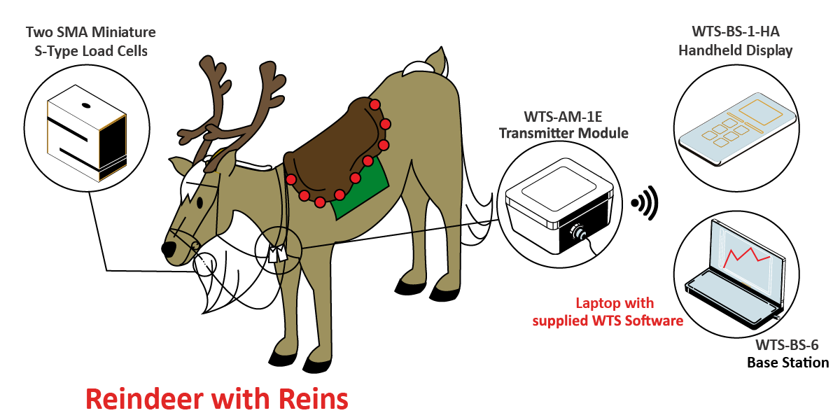 The SMA Miniature S-Type Load Cells are inserted into the line of the cheekpiece and reins on one side of the reindeer. The SMA Miniature S-Type Load Cell’s are resistive wire strip strain gages whose changes in potential difference, produced with strain, are transferred to transmitters which send the data wirelessly to a receiver connected to a USB port of a PC or a WTS-BS-1-HA Handheld Module. The WTS-AM-1E Transmitter Module are held inside modified camera cases attached to a breastplate on the reindeer. The rider is therefore not carrying any of the electrical equipment. Before the data is collected and after the cheekpiece is pretensioned, the SMA Miniature S-Type Load Cells are tared to zero. This makes it possible in some cases to see negative net values for cheekpiece tension when rein tension is applied to the cheek. The rider takes a normal contact on both reins and performs ridden exercises in the three lower gaits, and the natural resistive counter-contact from the body of the horse provides pairs of force data from the rein and cheekpiece. Because the cheekpiece is directly attached to the headpiece, we can assume that forces seen in the cheekpiece are those that are applied to the poll of the reindeer.