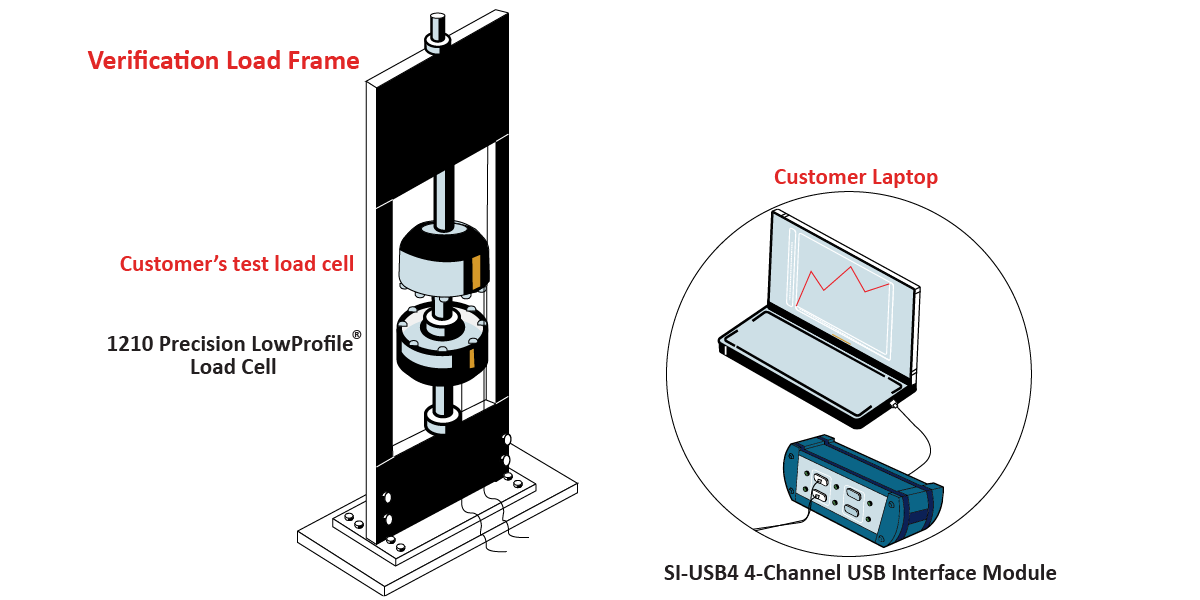 The customer installed their Model 1210 Precision LowProfile Load cell into the verification load frame. Model SI-USB PC Interface Module displayed and recorded applied forces for review and record keeping on the customer’s computer. This allows the customer to have a proven load cell verification test stand at their disposal to ensure its test load cell is always in working order.